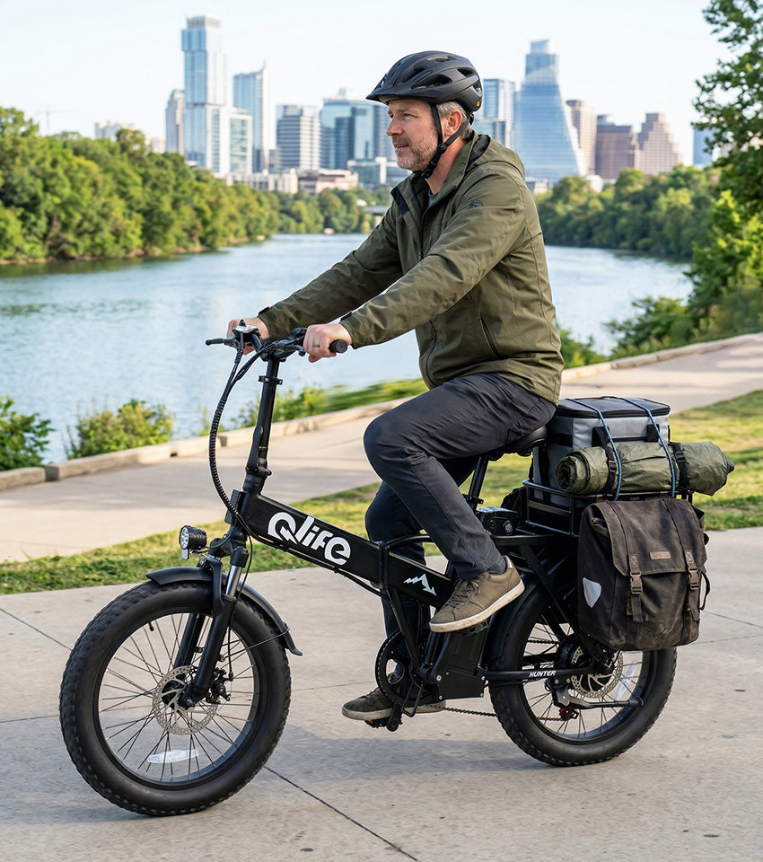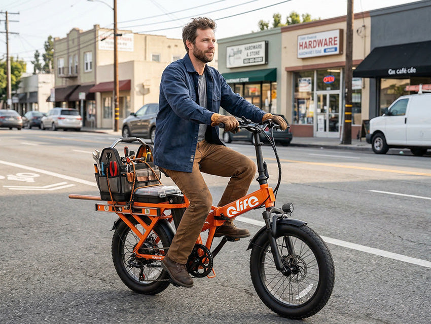 The Hunter electric bike comes with an ultra-long integrated cargo rack that can carry up to 400 lbs, letting you haul more packages, tools, or gear in a single trip. Designed for delivery riders, couriers, and service professionals, it combines rugged all-terrain performance, foldable convenience, and unbeatable value. Whether it’s city streets or light off-road, Hunter is your ultimate workhorse on two wheels.
